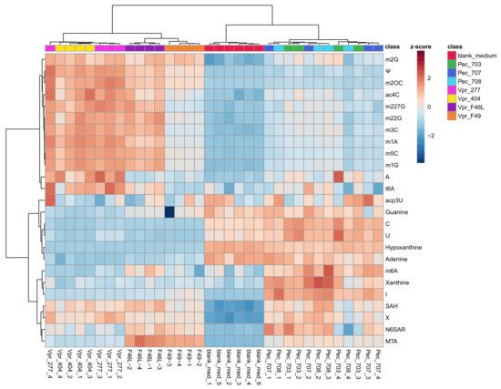 As depicted in the heat map (Figure 2), PEC cell lines and blanks were clustered close together, whereas VPR cell lines formed a separate cluster. This emphasizes the altered metabolism of VPR cell lines in contrast to PEC cell lines. It can be clearly seen that modified nucleosides were increased in VPR cell lines and were low in the PEC cells and blank medium. The relative concentrations of the respective metabolites are represented by the colors of the z-score. Higher relative concentrations are depicted in a redder tint, whereas lower concentrations are represented by more blue tints.