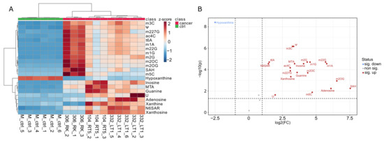 The VPR cells grown under low-serum conditions (0.5% FCS) exhibited a comparable nucleoside profile to the VPR cells grown under 10% FCS conditions. Normalized nucleoside intensities and statistical results are shown in Supplementary Tables S3 and S4. These findings corroborate the method’s validity regarding its outcomes and stability. The LC-MS measurement of these samples demonstrated that the VPR cells excrete modified nucleosides in detectable amounts even under low-serum conditions comparable to the 10% serum condition. The corresponding heat map (Figure 4A) depicts the three measured VPR cell lines in triplicate and one cell line measured in a pentaplicate as well as six blank medium controls. For each sample, the respective nucleosides were analyzed, and it is clearly visible that modified nucleosides were excreted in the blank medium. The respective VPR cell lines were clustered in distinguishable groups, indicating their similarities to themselves and the differences to the control regarding their metabolism. One can also see that hypoxanthine from the medium was almost entirely consumed by the cells. The volcano plot (Figure 4B) proves this circumstance by displaying the significantly increased or decreased compounds. It can be seen that modified residues were excreted, and hypoxanthine from the medium was consumed. The volcano plot confirms our findings even under a nutrient-depleted environment. Importantly, Ψ, m3C, m5C and m2OC were among the substantially secreted nucleosides, as seen in the other, independent ccRCC cell lines. This highly reproducible feature of the VPR mouse model highlights them as promising candidates for ccRCC biomarkers.