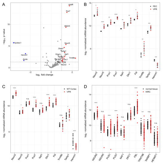Analysis of RNA-modification genes. (A) The log2-fold changes (5 VPR cell lines compared to 3 PEC samples) and corresponding p-values of 152 genes involved in RNA modification are plotted. The 3 genes that decreased more than two-fold are depicted in blue and the 15 genes that increased more than two-fold are labeled in red. The dashed lines indicate the log2 fold change cut-offs (vertical lines at −1 and 1) and p-value cut-off (horizontal line at 0.05). Statistics were obtained using DESeq2. (B–D) The log2-normalized mRNA abundance is shown in the same VPR cell lines (N = 5) and PEC (N = 3) (B), in VPR tumors (N = 12) and WT cortex (N = 9) (C), and in human tumors (TCGA KIRC (Kidney Renal Clear Cell Carcinoma), N = 72) and matched normal tissue (N = 72) (D). Only those genes are shown which match the cut-offs and which produce the detected modified nucleosides. Error bars indicate the mean and standard deviation. The p-values were obtained from DESeq2 using Wald statistics (n.s. not significant, * p < 0.05, ** p < 0.01, *** p < 0.001, **** p < 0.0001).