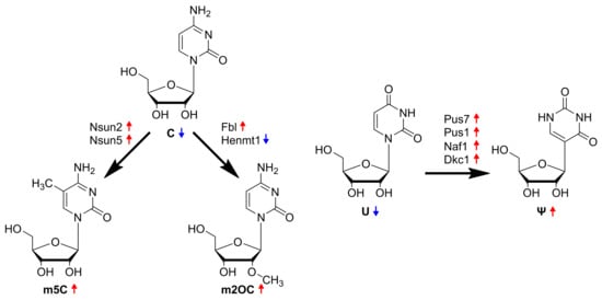Summary of key findings: In ccRCC cells derived from the VPR mouse model, the modified nucleosides m5C, m2OC and Ψ, in addition to others, are excreted to the extracellular space. Accordingly, their unmodified precursor nucleosides C and U are reduced (indicated by a blue arrow pointing downwards). Several nucleoside-modifying enzymes responsible for these conversions are elevated in VPR cancer cells (indicated by a red arrow pointing upwards).