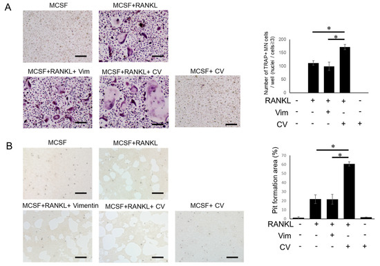 CV promotes RANKL-mediated OC-genesis. M-CSF (20 ng/mL)-primed OC precursors derived from mouse bone marrow were stimulated with RANKL (50 ng/mL) in the presence or absence of vimentin (Vim) or CV for 7 days by exchanging 50% of culture medium with fresh medium every 3 days. (A) TRAP staining and (B) pit formation assay were performed. The number of TRAP-positive cells with more than 3 nuclei were counted. The resorption pit area was measured using ImageJ. All in vitro assays were performed in triplicate and the results were expressed by the mean ± SD. All experiments were independently performed three times. * p < 0.01. Scale bar: 100 μm.
