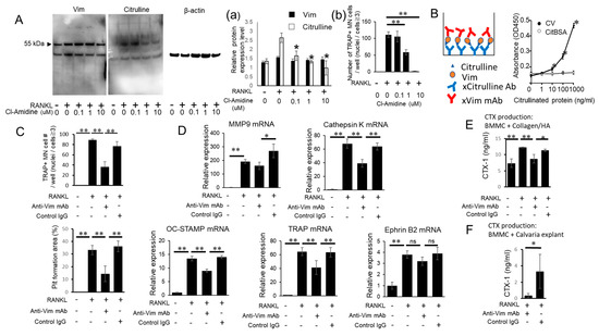 Possible engagement of Cl-amidine-sensitive PAD in the citrullination of vimentin and anti-vimentin mAb-mediated interruption of CV-induced OC-genesis. (A) OC precursors were stimulated with or without RANKL (50 ng/mL) and/or Cl-amidine. After 24 h, supernatant and cell lysates were collected and vimentin (Vim) or citrulline was detected by Western blotting using the antibodies described in the Materials and Methods section. Protein bands were measured by densitometry to determine the levels of Vim, citrulline and β-actin and relative expression of Vim and citrulline was calculated in comparison with an internal control of β-actin (Figure 2(Aa)). After 6 days of above-noted OC-genesis conditions, TRAP staining was performed (Figure 2(Ab)). (B) Sandwich ELISA to determine citrullination of Vim. Anti-citrulline antibody was used as a capture antibody and anti-Vim antibody as a detection antibody. Different concentrations of CV and citrullinated BSA (CitBSA) (0, 1, 10, 100 and 1000 ng/mL) were used as a sample. (C,D) OC precursors were stimulated with RANKL in the presence or absence of anti-Vim mAb or control IgG for 48 h or 7 days with the addition of fresh medium every 3 days. TRAP staining, pit formation assays and qPCR were performed. (E,F) OC precursors were cultured on a type I collagen-treated hydroxyapatite coating plate (E) or on murine calvaria bone disks (F). After 7 days, the supernatant was applied to CTX-1 ELISA. All in vitro assays were performed in triplicate and the results were expressed as the mean ± SD. All experiments were independently repeated three times. * p < 0.05; ** p < 0.01. #: number.