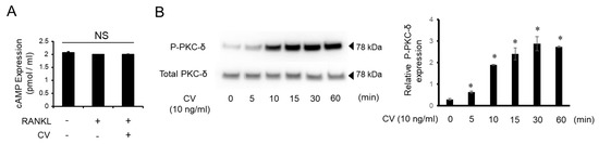 To gain a more mechanistic insight into the CV-mediated upregulation of OC-genesis, PCR arrays were performed to explore the cell signaling pathway elicited by CV in the OC precursors and PKA/cAMP and/or PKC-δ pathways were indicated (data not shown). The level of cAMP in the OC precursors was not affected by the addition of CV (Figure 3A). On the other hand, according to W-blot, CV significantly promoted the phosphorylation of PKC-δ in the RANKL-stimulated OC precursors in a time-dependent manner (Figure 3B).