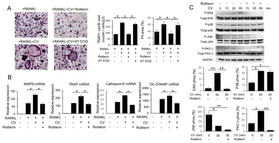 To determine if CV-elicited PKC-δ signaling could lead to the upregulation of OC-genesis, Rottlerin, a PKC-δ inhibitor, as well as KT5720, a PKA inhibitor, were applied to the RANKL-primed OC precursors. Rottlerin, but not KT5720, significantly inhibited the OC differentiation upregulated by CV (Figure 4A). Moreover, Rottlerin suppressed OC-related genes such as MMP9, TRAP, Cathepsin K and OC-STAMP mRNAs (Figure 4B). It has been reported that LPS-induced osteolysis is mediated by upregulated OC-genesis through the cell signaling of the PKC-δ/ERK-MAPK axis [52]. Therefore, we also investigated the effects of Rottlerin on the phosphorylation induced in three major MAPK molecules; namely, p38, ERK and JNK. Rottlerin inhibited CV-induced ERK phosphorylation, whereas it showed little or no effect on the phosphorylation of p38 and JNK (Figure 4C). These results indicated that the PKC-δ/ERK axis was involved in the CV-mediated upregulation of RANKL-induced OC-genesis.