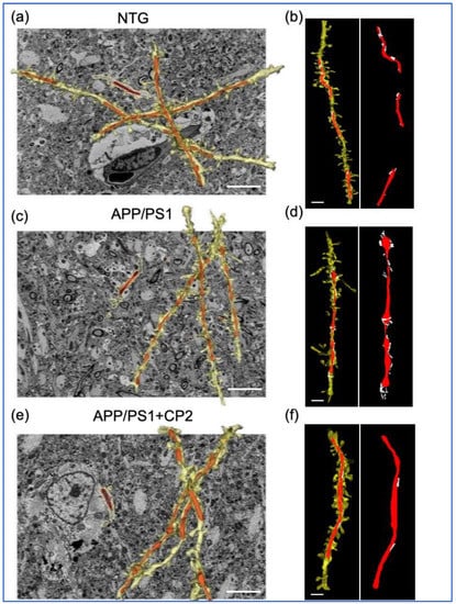 Application of SBFSEM and 3D EM reconstructions to establish changes in mitochondrial morphology and MERCS in response to CP2 treatment. Representative 3D EM reconstructions of dendrites (yellow) and mitochondria (red) in hippocampal CA1 region of NTG (a), APP/PS1 (c) and APP/PS1+CP2 (e) mice. Scale bars, 5 μm. Representative 3D EM reconstructions of dendrites (yellow), mitochondria (red), and the ER (white) in hippocampal CA1 region of NTG (b), APP/PS1 (d) and APP/PS1+CP2 (f) mice. Scale bars, 2 μm. The Reconstruct software was applied to micrographs from 20–40 serial sections 0.09 μm thick generated using SBFSEM.