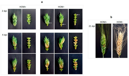 Examples of phenotypes of Fg-inoculated spike sections at 2 and 4 days post inoculation (dpi) (a) and of the whole spike at 21 dpi (b) for the resistant HOM+ and susceptible HOM− genotypes. White arrows indicate early browning of the inoculated floret of the susceptible genotype.