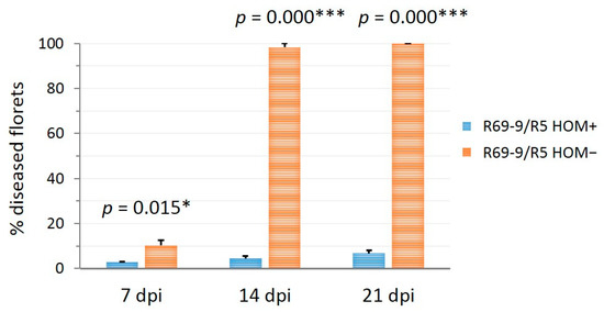 At 2 dpi, phenotypic differences between HOM+ and HOM− plants were hardly noticeable. Fg-inoculated spikelets and the associated rachis portions of the HOM+ plants did not show any visible change with respect to the mock-inoculated HOM+ plants (Figure 2a). On the other hand, the beginning of tissue browning could be seen at the Fg-inoculation site and adjacent rachis portion of HOM− plants (white arrows, Figure 2a). Differences became much more visible at 4 dpi, when disease symptoms in HOM− plants comprised in all cases floret(s) adjacent to the inoculated ones (mostly entire spikelets), and browning of the rachis extended from the Fg-inoculation sites toward both spike extremes (Figure 2a), clearly showing tissue colonisation by the fungus and intensive diffusion of the disease. By contrast, HOM+ plants showed browning of the inoculated florets only and did not display any symptoms on the rachis, indicating that disease spreading was stopped at the rachis nodes of the Fg-inoculated florets. Development of disease symptoms along the spikes until 21 dpi (Figure 2b) followed a similar dynamic to that already observed in durum wheat Thinopyrum spp. recombinants having the same or similar composite introgressions (all including the same Fhb7E locus as of HOM+) and in their HOM− sibs [66]. In the present observations, the difference in disease severity between HOM+ and HOM− lines was statistically significant at all time points, reaching 93% reduction in disease symptoms at 21 dpi in the former vs. the latter, thus confirming the exceptional efficacy of the Fhb7E locus from Th. elongatum (Figure 3). On the other hand, virtually all of the susceptible HOM− plants had 100% of diseased florets already at 14 dpi (Figure 2b).