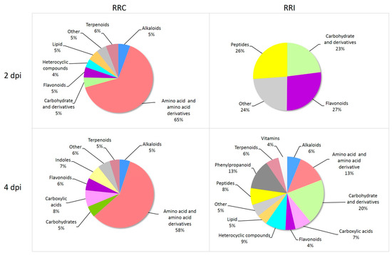 Metabolites extracted from rachis samples at 2 and 4 dpi were analysed by liquid chromatography coupled with high-resolution accurate mass spectrometry (HRAM). Differentially expressed metabolites between HOM+ and HOM− genotypes identified in mock- and Fg-inoculated samples were indicated as resistance-related constitutive (RRC) and resistance-related induced (RRI), respectively, and the observed relative proportions are reported in Figure 4.