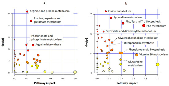 Metabolomics Pathway Analysis (MetPA) of rachis tissue from the resistant Fhb7E (HOM+) and susceptible (HOM−) lines at 4 dpi after water (mock) or Fg treatment: (a) mock-HOM+ vs. mock-HOM−, and (b) Fg-HOM+ vs. Fg-HOM− comparisons. All matched pathways are displayed as circles. The colour of each circle is based on p-values (darker colours indicate more significant changes of metabolites in the corresponding pathway), whereas the circle size corresponds to the pathway impact score. The most impacted pathways (high statistical significance scores) are annotated by their full name (Phe, phenylalanine; Tyr, tyrosine; Trp, tryptophan).
