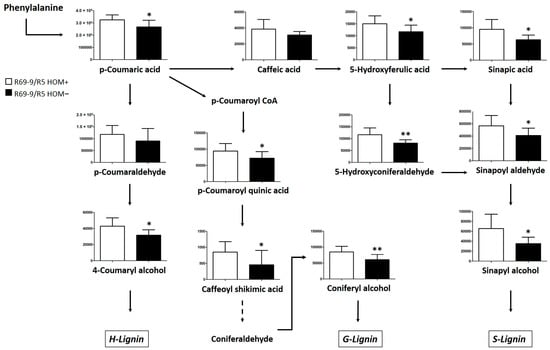 Significant changes in accumulation of intermediates of the phenylpropanoid biosynthetic pathway in the resistant Fhb7E (HOM+) vs. susceptible (HOM−) lines at 4 dpi (Fg). Values on y-axes always indicate Peak intensity of a given metabolite, while bars on histograms represent standard deviations of means. Comparison for each metabolite between HOM+ and HOM− genotype was analysed using Student’s t-test; * and ** indicate p-values at <0.05 and <0.01 levels of significance, respectively. Solid arrows between metabolites indicate a direct transforming relationship, while the dotted arrow indicates an indirect process (more than one step).
