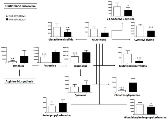 Significant changes in accumulation of intermediates of glutathione metabolism in rachis tissue of the resistant Fhb7E (HOM+) and susceptible (HOM−) lines at 4 dpi (Fg) and their connection with the polyamine biosynthesis pathway. Values on y-axes always indicate Peak intensity of a given metabolite, while bars on histograms represent standard deviations of means. Comparison for each metabolite between the HOM+ and HOM− genotypes was analysed using Student’s t-test; *, ** and *** indicate p-values at <0.05, <0.01, and <0.001 levels of significance, respectively. Arrows indicate a direct process between molecules.