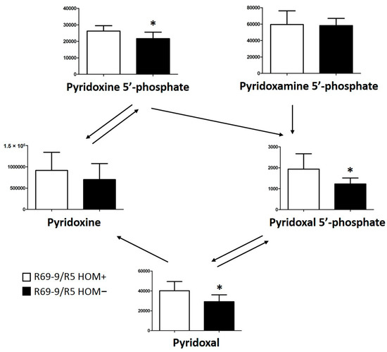 Significant changes in accumulation of intermediates of vitamin B6 in rachis tissue of the resistant Fhb7E (HOM+) and susceptible (HOM−) lines at 4 dpi (Fg). Values on y-axes always indicate Peak intensity of a given metabolite, while bars on histograms represent standard deviations of means. For each metabolite, comparison between the HOM+ and HOM− genotypes was analysed using Student’s t-test; * indicates p-value at the <0.05 level of significance. Arrows between metabolites indicate a direct transforming relationship. Double arrows denote a reversible reaction.