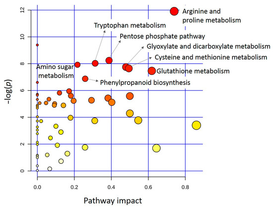 Metabolomics Pathway Analysis (MetPA) of grain tissue from the resistant Fhb7E (HOM+) vs. susceptible (HOM−) lines at maturity, after inoculation with Fg. All the matched pathways are displayed as circles. The colour of each circle is based on p-values (darker colours indicate more significant changes of metabolites in the corresponding pathway), whereas the size of the circle corresponds to the pathway impact score. The most impacted pathways, having high statistical significance scores, are annotated by their full name.