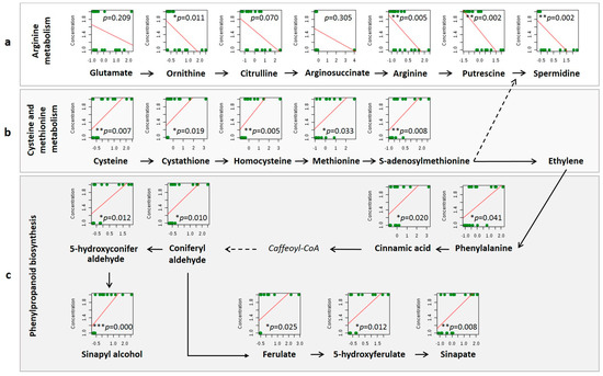 Significant changes in accumulation of intermediates of “Arginine metabolism” (a), “Cysteine/methionine metabolism” (b) and the “Phenylpropanoid biosynthetic pathway” (c) in Fg-inoculated grain tissues of the resistant Fhb7E (HOM+) vs. susceptible (HOM−) lines. The distribution of the compound concentration, as from Metaboanalyst 5.0 software (red lines), was analysed using Student’s t-test. *, ** and *** indicate p-values at <0.05, <0.01 and <0.001 levels of significance, respectively. Solid arrows between metabolites indicate a direct transforming relationship, while dotted arrows indicate an indirect process (more than one step).