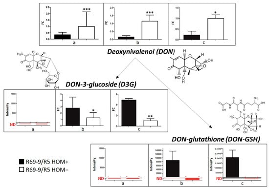 Relative quantities (FC, intensity) of DON and its D3G and DON–GSH conjugates in HOM+ and HOM− Fg-inoculated rachises at 2 dpi (a) and 4 dpi (b), and in mature grains (c). Red dotted lines indicate no detection (ND), i.e., the metabolite is not present or present in minimal amounts, not distinguishable from the instrument’s background noise. At each time point × tissue combination, the data of HOM+ vs. HOM− Fg-inoculated samples were analysed using Student’s t-test at p < 0.05 *, 0.01 ** and 0.001 *** significance levels. Arrows indicate possible DON biotransformations.