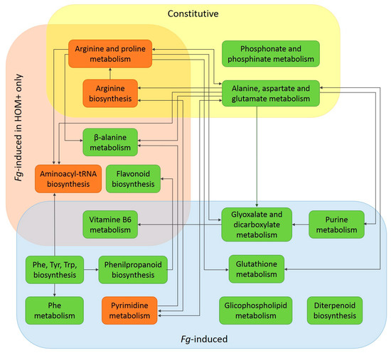 To better understand the functional roles of the identified specific RRC and RRI metabolites in the response to Fg infection, a detailed analysis of altered metabolic pathways and networks was carried out on 4 dpi extracts. The web-based tool MetPA was used to analyse the following comparisons: HOM+ Fg-inoculated vs. HOM+ mock (Figure S1a), HOM− Fg-inoculated vs. HOM− mock (Figure S1b), HOM+ mock vs. HOM− mock (Figure 5a) and HOM+ Fg-inoculated vs. HOM− Fg-inoculated (Figure 5b).