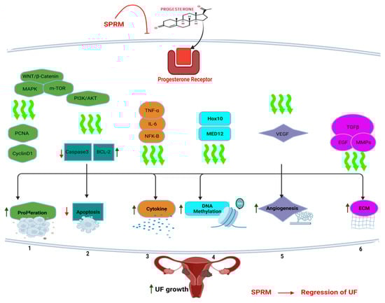 Disrupted progesterone signaling is causally linked to many reproductive diseases that result in subfertility or infertility, including UF []. Progesterone signaling, via its receptor, can affect several pathways and interact with different molecules, which in turn stimulates cells towards UF phenotype through the following functions: