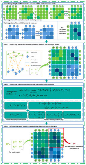 Given the abundance of existing SMs and miRNAs, it is critical to pre-screen out SM–miRNA samples with high association probabilities for complex and expensive biological experiments. The proposed predictive approaches may be divided into network inference-based models and matrix-completion-based models. For the first kind of model, Guan et al. [20] proposed a model called Graphlet Interaction-based Inference for Small Molecule–miRNA Association Prediction (GISMMA). Based on the integrated SM/miRNA similarity (the widely used SM/miRNA similarities include the side-effect-based SM similarity, the chemical-structure-based SM similarity, the functional consistency-based SM similarity, the indication phenotype-based SM similarity, the gene functional consistency-based miRNA similarity, and the disease-phenotype-based miRNA similarity), they first constructed the SM/miRNA similarity network. Then, a specific SM–miRNA association score was calculated by counting the number of graphlet interactions throughout the SM/miRNA similarity network. Furthermore, Li et al. [21] developed the Small Molecule–miRNA Network-Based Inference (SMiR-NBI) predictive model. In a constructed SM–miRNA heterogeneous network, a given SM node evenly distributes the obtained initial resources to the miRNA nodes regulated by it. Following this, these miRNA nodes immediately distribute the obtained resources to the SM nodes adjacent to them. As the resources are continuously propagated through the network, the resource allocation of all nodes eventually stabilizes. The final resource fraction of the miRNA nodes reflects the possibility of being regulated by the given SM. Notably, the model is incapable of predicting miRNAs or SMs that are potentially associated with new SMs or miRNAs. Additionally, Qu et al. [22] proposed the Triple Layer Heterogeneous Network-based Small Molecule–miRNA Association (TLHNSMMA) predictive model. They first constructed an SM–miRNA-disease triple layer heterogeneous network. An iterative update algorithm was then applied to obtain the association scores of all SM–miRNA pairs. Benefiting from the introduction of additional information, the model demonstrated excellent prediction accuracy. However, it is likewise not applicable to predict miRNAs or SMs that are potentially associated with new SMs or miRNAs. In view of the unreliability of all the aforementioned methods due to the presence of noise data, Yin et al. [23] developed a new computational method called Sparse Learning and Heterogeneous Graph Inference for Small Molecule–miRNA Associations (SLHGISMMA) prediction. They first decomposed the SM–miRNA association matrix into two parts, in which the first part is a linear combination of the original association matrix and a low-rank matrix, and the second part is a sparse noise matrix. After eliminating the noise matrix, they integrated the SM/miRNA similarity information and the information in the reacquired association matrix into a heterogeneous graph. Finally, the association scores were obtained by implementing a heterogeneous graph inference algorithm. The drawback of SLHGISMMA is that it cannot restrict the prediction scores in [0, 1], which reduces the interpretability and accuracy of the association scores.