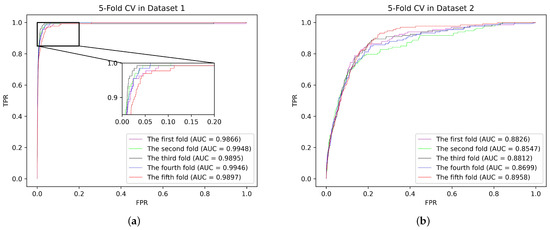 From Table 4, we observe that AMCSMMA achieved a higher AUC and a lower SD than did the compared models based on both datasets, which indicates that it has superior predictive performance and robustness. Figure 4 shows the ROC curves of each fold in one five-fold CV based on two datasets and the areas under the curves.
