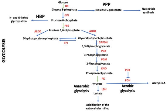 Glycolytic Metabolism. Enzymes and metabolites are depicted as well as some of the pathways that branch off from glycolysis and are discussed in the text. Green arrows indicate irreversible reactions. The final steps occurring under aerobic (aerobic glycolysis) or anaerobic conditions (anaerobic glycolysis) are indicated. ALDO, fructose-biphosphate aldolase; ENO, enolase; GAPDH, glyceraldehyde 3-phosphate dehydrogenase; GPI, glucose 6-phosphate isomerase; HBP, hexosamine biosynthetic pathway; HK, hexokinase; LDH, lactate dehydrogenase; PDH, pyruvate dehydrogenase; PDK, pyruvate dehydrogenase kinase; PFK, phosphofructo-2-kinase; PGK, phosphoglycerate kinase; PGM, phosphoglycerate mutase; PK, pyruvate kinase; PPP, pentose phosphate pathway; TPI, triosephosphate isomerase.