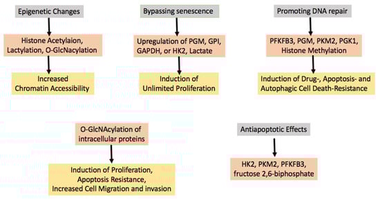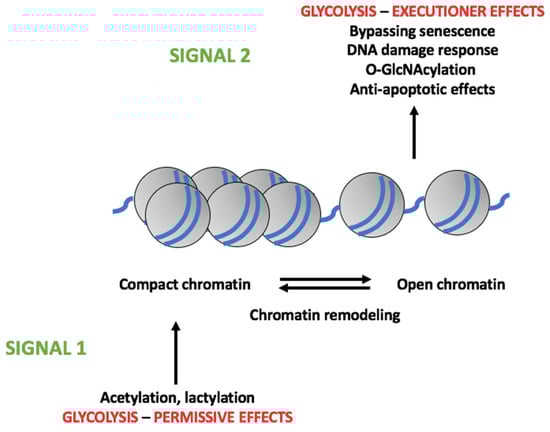 As already discussed in the beginning, epigenetic modifications are now considered a fundamental mechanism leading to the expression of oncoproteins and/or inhibition of oncosuppressive proteins. Glycolytic metabolism was found to increase chromatin accessibility by inducing global histone acetylation, thereby facilitating DNA repair and increasing resistance to DNA-damaging drugs []. Along similar lines, it has been shown that pituitary tumor cells overexpressing GLUT1 undergo a metabolic reprogramming towards glycolysis when cultured at high glucose concentrations. The upregulation of glycolytic metabolism then led to an increase in histone acetylation (in particular at H3K9). This effect, in turn, increased the expression of telomerase reverse transcriptase (TERT) and, consequently, the proliferation of pituitary tumor cells []. Lactate may also play an important role, because it has been shown to derivatize histone lysine residues (“lactylation”) and this, in turn, increased chromatin accessibility []. It has been suggested that the histone lactylation-induced increase in chromatin accessibility may promote the expression of oncoproteins driving neoplastic transformation. Histone O-GlcNacylation has also been shown to influence the chromatin structure and regulate gene expression []. Eventually, the effect of nuclear HK2 leading to an increase in open chromatin conformation has been discussed before [].