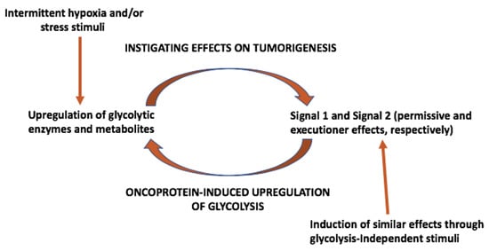 Together, the examples that have been listed in the present and the previous sections show that the oncoprotein- or oncosuppressive protein-driven upregulation of glycolytic metabolism plays, in the models that have been discussed, a necessary role for early tumorigenesis, thereby supporting the clinical observations that have been described in Section 2.