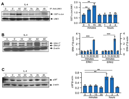 Effects of IL-4 on MAPK activation. Bone-marrow-derived macrophages were cultured for 6 days in the presence of M-CSF. Then, to render the cells quiescent, they were deprived of M-CSF for 18 h. At this point, IL-4 (10 ng/mL) or M-CSF (10 ng/mL) was added for the indicated periods of time. (A) JNK-1 activity was studied after immunoprecipitation and then an in vitro kinase assay was performed on recombinant c-Jun. An immunoblot for JNK-1 was performed in parallel as a loading control for the kinase assay. (B,C) Activation of MAPK ERK-1/2 and the phosphorylated form of p38 were analyzed via Western blot using the corresponding antibodies. In parallel, as a loading control, an immunoblot for β-actin was performed. Images on the right depict quantification by densitometry of 3 independent experiments. The results are shown as the mean ± SD. ** p < 0.01 and *** p < 0.001 in relation to the corresponding treatments with IL-4 after all the independent experiments had been compared. Data were analyzed using Student’s t-test.