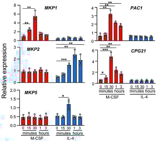 Effects of IL-4 on MKP expression. Macrophages were treated with M-CSF (control) or IL-4 for the indicated periods of time. MKP expression was analyzed by qPCR. The results are shown as the mean ± SD of 3 independent experiments. * p < 0.05, ** p < 0.01, and *** p < 0.001 in relation to the corresponding treatments after all the independent experiments had been compared. Data were analyzed using Student’s t-test.