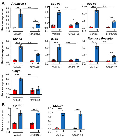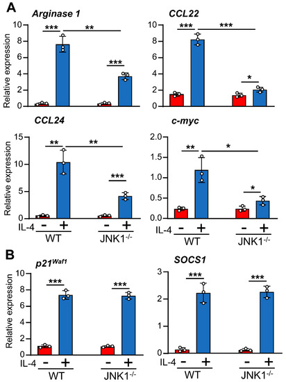 To determine the role of JNK-1 in IL-4-induced gene expression, we used the selective inhibitor SP600125 and the JNK-1 knockout mouse model. Previous studies conducted by our group demonstrated that the dose of SP600125 used in the macrophages in this study blocks JNK activity without inducing cellular toxicity [31]. Surprisingly, the inhibition of JNK with SP600125 resulted in the efficient blockage of the expression of a subset of genes, including Arginase 1, Mannose Receptor, CD163, and c-myc; the chemokines CCL22 and CCL24; and the cytokine IL-10 (Figure 3A), whereas the expression of SOCS1 or p21Waf−1 was not significantly reduced (Figure 3B), thereby suggesting that the link between JNK-1 and IL-4 responses may be promoter-dependent. We also performed similar experiments using SB203580 to inhibit p38 and PD98059 to block MEK and, therefore, ERK-1/2 activity; however, none of these inhibitors significantly reduced the expression of the genes tested (Supplementary Materials Figure S1). To confirm the role of JNK-1, we also used macrophages from JNK1−/− mice. In these cells, the expression of Arginase 1, CCL22, CCL24, and c-myc was drastically downregulated (Figure 4A). However, the levels of SOCS1 or p21Waf−1 were not affected (Figure 4B).