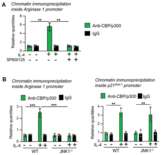 First, we tested whether CBP/p300 binds to the Arginase 1 promoter in our macrophage model, as described before in other types of cells [41,42]. We stimulated quiescent macrophages with IL-4 for 15 min. Using chromatin immunoprecipitation assays, we observed that the treatment with IL-4 induced the binding of CBP/p300 to the Arginase 1 promoter, which was reversed by SP600125 (Figure 7A). To confirm these results, we used the JNK-1−/− model. We stimulated the cells with IL-4 for 15 min and performed chromatin immunoprecipitation assays. In JNK-1−/− cells, after stimulation with IL-4, no increase in the binding of CBP/p300 to the Arginase 1 promoter was observed (Figure 7B). Moreover, we also examined the recruitment of CBP/p300 in the promoter of p21Waf−1, whose expression is not inhibited in the absence of JNK-1 (Figure 3). In this case, we still detected the binding of CBP/p300 in the JNK-1−/− cells treated with IL-4 (Figure 7B). These data suggest that JNK-1 activity is required for the recruitment of cofactors in some IL-4-induced genes.