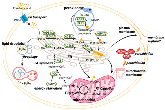 - Cui, W.; Liu, D.; Gu, W.; Chu, B. Peroxisome-driven ether-linked phospholipids biosynthesis is essential for ferroptosis. Cell Death Differ. 2021, 28, 2536–2551. [Google Scholar] [CrossRef] [PubMed]