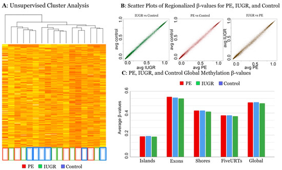 An unsupervised cluster analysis based on methylation values was performed on all samples, generating a clustered heatmap using R’s heatmap function. Except for a single cluster of four control samples, no clustering of samples was observed (Figure 1A). Next, we performed a comparison of regionalized β-values between IUGR, PE, and control groups in the context of large genomic and CpG island associated features. This comparison revealed slightly more variation at intermediately methylated regions compared to hyper and hypomethylated regions but no significant deviation from expected correlations between the various groups (Figure 1B). Regionalized β-values were observed to vary slightly more between IUGR and PE than between IUGR and control or PE and IUGR (Figure 1B).