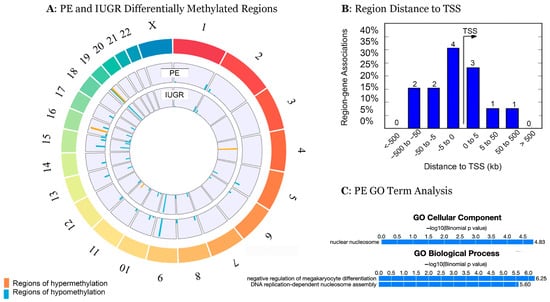 Comparative methylation profiles and ontological analysis of placental tissues. Circos Plot indicating regions of significant hyper and hypomethylation (FDR > 13) across the genome in PE (outer ring) and IUGR (inner ring) (A). Height of region indicates the size of variance from control (log2ratio). Distance of each region from transcription start site of the most differentially methylated regions (FDR > 40) (B). GO term analysis of the most differentially methylated regions for PE (C).