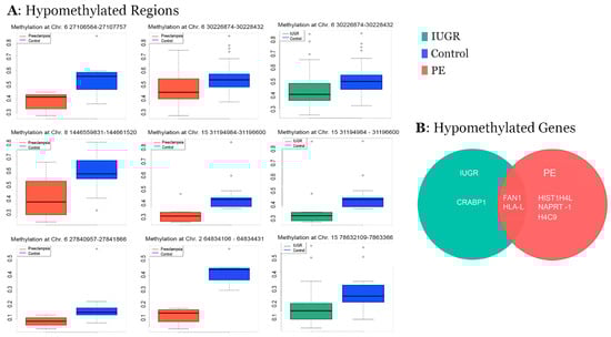 Shared areas of hypomethylation at key regulatory regions in both PE and IUGR placental tissues. Bar plots indicating methylation beta-values at significantly hypomethylated regions (FDR > 40) in IUGR and PE samples compared with control (A). Venn diagram of each hypomethylated gene promoter region associated with PE and IUGR (B).