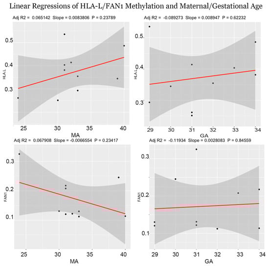 Linear regressions comparing FAN1/HLA-L gene promoter hypomethylation to maternal age (MA)/gestational age (GA). Plot legends include adjusted R2 values, slopes, and p-values.