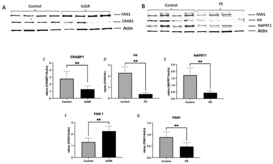 Western blot was performed to determine the protein expression of genes with methylation in IUGR (CRABP1), PE (HIST1H4L and NAPRT1) and a commonly shared gene (FAN1). A characteristic Western bot is shown in Figure 5A,B. The CRABP1 gene produces the Cellular retinoic acid-binding protein 1. This protein is responsible for the delivery of Retinoic Acid (RA) to its receptors thereby regulating its bioavailability and metabolism [24,25]. RA is important for the development of a healthy placenta by regulating the function of trophoblast placental cells [26]. We observed that CRABP1 protein was decreased (2.2-fold; p < 0.004) in the IUGR placenta compared to controls (Figure 5C). HIST1H4L encodes the Histone 4 (H4) protein. H4 is one of the Histone core proteins that form the nucleosome [27]. Depletion of H4 is known to induce genome instability by increasing homologous recombination [27]. We observed a 6.0-fold H4 decrease (p < 0.02) in the PE placenta as compared to the control (Figure 5D). The NAPRT1 gene encodes the Nicotinate Phosphoribosyltransferase protein (NAPRT). This protein is associated with the prevention of oxidative stress [28]. In the PE placenta, there was a decrease (4-fold; p < 0.003) in NAPRT1 compared to controls (Figure 5E). FAN1 encodes the FANCD2/FANCI-associated nuclease 1 enzyme (FAN1). Mutations in FAN1 are associated with the development of disease due to impaired DNA damage repair [29,30,31]. In the IUGR placenta, FAN1 protein was increased (1.7-fold; p < 0.002) compared to controls (Figure 5F). In contrast, FAN1 protein was decreased (1.8-fold; p < 0.002) in the PE placenta compared to controls (Figure 5G)