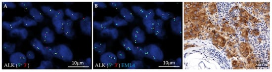 All 210 cases were successfully analyzed by FISH for ALK, ROS1, RET, NTRK1, NTRK2 and NTRK3. ALK, ROS1, RET, NTRK1, NTRK2 and NTRK3 rearrangements were tested by a break-apart FISH probe approach: the ZytoLight SPEC ALK/EML4 TriCheck Probe, ZytoLight SPEC ROS1 Dual Color Break Apart Probe, ZytoLight SPEC RET Dual Break Apart Probe, ZytoLight SPEC NTRK1 Dual Break Apart Probe, ZytoLight SPEC NTRK2 Dual Break Apart Probe and ZytoLight SPEC NTRK3 Dual Break Apart Probe (Zytovision GmbH, Bremerhaven, Germany) were used, following the manufacturer’s suggested protocol. FISH testing was performed on formalin-fixed, paraffin-embedded (FFPE) tissue, utilizing 4μm tumor tissue sections of LuAD specimens as previously described []. For each case, a minimum of 50 tumor nuclei were observed independently by two expert cytogenetists using a Zeiss Axioscope system (Zeiss, Milan, Italy), and the analysis was performed using Metafer v4.1.1 software, which is able to count probe signals and identify the number of fused or split signals (MetaSystems s.r.l., Milan, Italy). A sample was called true positive if ≥15% of tumor nuclei showed convincing split signals (green and red signal distance ≥ 2 signal diameters) or a single 3′ signal, according to international guidelines [,]. The presence of an EML4::ALK fusion was indicated by green and red split signals, each of which fused to a blue signal in ≥15% of observed tumor nuclei.