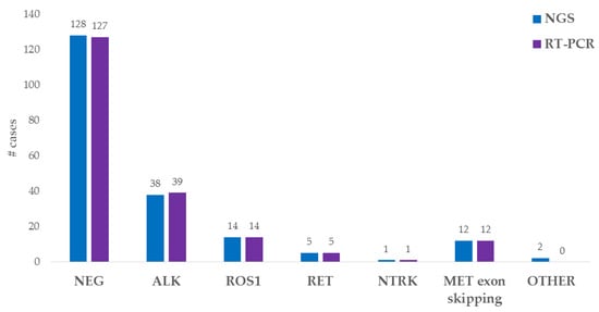 We analyzed 198 NGS-tested samples also by RT-PCR (the 2 cases carrying gene fusions not involving ALK, ROS1, RET, NTRK1, NTRK2 or NTRK3 were excluded because those genes are not detected by the RT-PCR kit panel). We identified the presence of an alteration in 71 cases (36%): 39 ALK fusions, 14 ROS1 fusions, 5 RET fusions, 1 NTRK fusion and 12 MET exon 14 skipping. Three discordant cases were observed: two NGS-negative cases tested positive for ALK fusion by RT-PCR, and one case with an ALK fusion detected by NGS tested negative by RT-PCR. This last ALK fusion was not included in the RT-PCR kit panel.