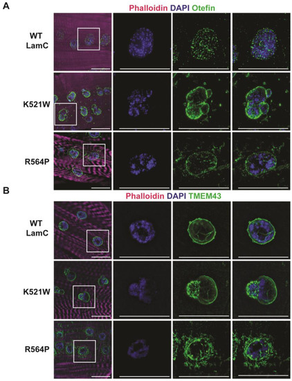 Emerin and lamins interact with TMEM43, a multipass transmembrane protein that resides in the inner nuclear membrane [96,97]. Mutations in TMEM43 also cause EDMD-related myopathy [97,98]. To determine if LamC K521W and R564P altered the localization of the Drosophila orthologue of TMEM43 [99], larval body wall muscles were stained with a TMEM43 antibody (PA5-110497, Thermo Fisher Scientific). Muscles expressing wild-type LamC showed immunostaining confined to the nuclear periphery (Figure 3B). Muscles expressing LamC K521W showed TMEM43 staining at the nuclear periphery with enrichment in the nuclear lobulations (Figure 3B). By contrast, expression of LamC R564P showed TMEM43 at the nuclear periphery and aggregated in the cytoplasm (Figure 3B). Collectively, these results support prior findings that disruptions in the nuclear lamina alter inner membrane protein organization.