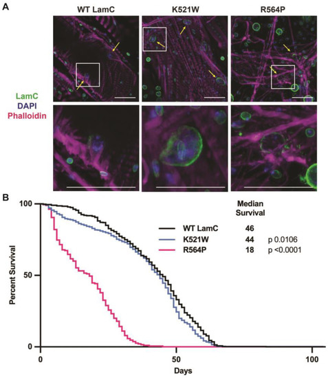 Drosophila stocks were maintained at 25 °C on a sucrose and cornmeal-based medium [53]. A full-length LamC cDNA (Gold Clone, Drosophila Genomics Resource Center) was used for site-directed mutagenesis (QuickChange, Agilent, Santa Clara, CA, USA) to generate base changes predicted to encode LamC p.K521W and p.R564P. The resulting mutated versions of LamC were cloned downstream of an upstream activating sequence (UAS) and a minimal promoter in the pUAST Drosophila transformation vector (Drosophila Genomic Resource Center, Bloomington, IN, USA). Transgenic stocks were generated by standard P-element transformation procedures (BestGene Inc., Chino Hills, CA, USA) [54]. Homozygous stocks were generated via crosses of flies heterozygous for the transgene to stock-bearing balancer (multiply inverted) chromosomes possessing the second and third chromosome markers Curly and Stubble, respectively (stock #2475, Bloomington Stock Center, Bloomington, IN, USA). The resulting progeny were interbred to recover homozygous flies lacking the marked balancer chromosomes.