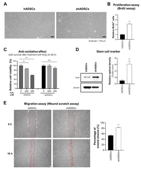 Characteristics and functionalities of enhanced hADSCs (ehADSCs). (A) Morphologies of hADSCs and ehADSCs. (B) ehADSCs showed greater proliferation, compared with hADSCs. (C) ehADSCs tolerated oxidative stress better than hADSCs. (D) ehADSCs showed more stem cell characteristics, compared with hADSCs. (E) Red mark area indicates the area of scratched wound site. Migration of ehADSCs and hADSCs. ehADSC mobility was significantly greater, compared with hADSC mobility. Values are means ± standard errors of the mean (** p < 0.01; n.s, not significant).