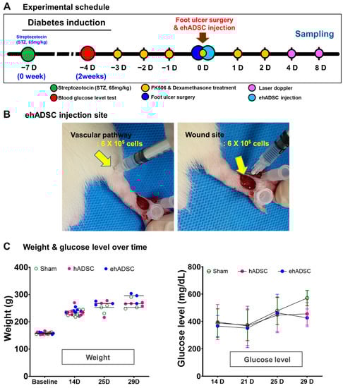 Experimental schedule, body weight, and blood glucose level. (A) In vivo experimental schedule. Diabetes was induced by intraperitoneal injection of streptozotocin (STZ, 65 mg/kg) in 6-week-old male Sprague–Dawley rats. On the fourth day of immunosuppressant administration, ehADSCs and hADSCs were injected topically into the foot near the artificial wound. Sampling was performed on days 4 and 8 after administration. (B) ADSCs injection site and route. ADSCs were injected around the vascular pathway (left) and near the wound (right). (C) Body weight and blood glucose level. There was no significant difference in body weight. There was no difference among groups in blood glucose levels until day 25, and blood glucose levels in ehADSC decreased on day 29, but there was no significant difference among groups.
