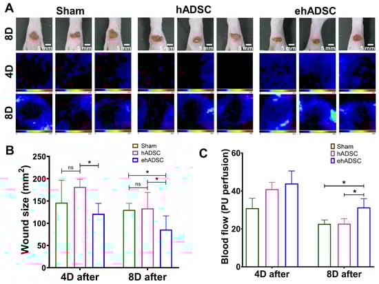 Wound closure and blood flow. (A) Wound size and Doppler evaluations were performed at 4 and 8 days after wound formation ADSCs injection. (B) At 4 days, a significant difference in wound size was observed between the hADSC and ehADSC groups. At 8 days, wounds in the ehADSC group were still significantly different (smaller) compared to others. (C) Blood flow 4 and 8 days after the ADSC injection are shown. There was no significant difference in the blood flow among the groups on day 4. On day 8, the ehADSC group exhibited a significantly increased blood flow compared to others. (* p < 0.05; ns, not significant).