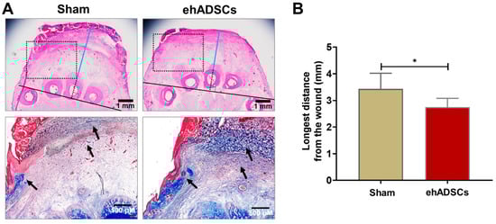 Wound histology. (A) Histological evaluation of wounds by H&E (soft tissue thickness between the epidermis and bone is a line drawn horizontally and vertically from the lower end of the animal’s 3rd toe bone and marked in blue from the upper end of the bone to the lower part of the wound) and Masson’s trichrome (dotted rectangle; collagen deposition was stained blue: black arrow) staining at 8 days. A tightly connected tissue structure and greater collagen deposition were observed in the ehADSC group, compared with the sham group. (B) The ehADSC group tended to exhibit a shorter bone-epidermis length, compared with the sham group (* p < 0.05).