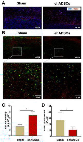 Epifluorescence analysis and TUNEL assay. (A) The ehADSC group exhibited greater RECA-1 staining intensity than the sham group on day 8. (B) The ehADSC group exhibited fewer TUNEL-positive cells than the sham group on day 8. (C) RECA-1 staining intensity in the wound area was significantly greater in the ehADSC group than in the sham group. (D) The number of TUNEL-positive cells in deep soft tissue was significantly lower in the ehADSC group than in the sham group (* p < 0.05).