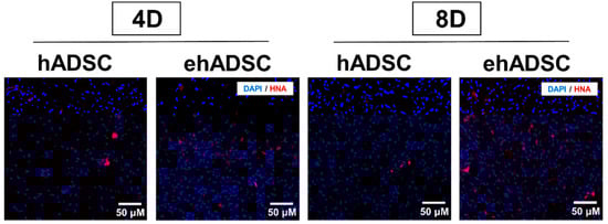 Epifluorescence analysis using HNA was performed. In both the hADSCs and ehADSCs group, some animals showed HNA-positive cells which are shown red in Figure 7. On day 4, the hADSC group showed the presence of HNA-positive cells in one animal among a total of three and the ehADSC group showed the presence of HNA-positive cells in two animals among a total of three. On day 8, hADSC showed the presence of HNA-positive cells in one animal among a total of four and the ehADSC group showed the presence of HNA-positive cells in two animals among a total of three. These results indicate that relatively more animals showed HNA-positive cells in the ehADSC group (Table 1).