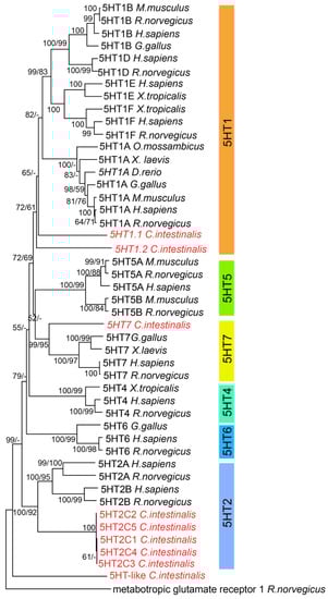 5-HT exerts its functions by binding to specific receptors that in humans have been classified into seven families (5HT1-7) and includes at least twenty subtypes [10]. 5HTR3 are ligand-gated ion channels while all the other serotonin receptors (5HTRs) are G-protein-coupled receptors that can stimulate or inhibit adenylyl cyclase upon bonding to the ligand. They are all expressed in the central nervous system (CNS) and various body districts, such as the gastrointestinal tract or cardiovascular system [10,11]. Homologs of 5HTRs are widely present in invertebrates from planarians [12] to mollusks [3,9] and insects [13,14]. Based on evolutionary studies, 5HTRs are among the oldest receptors of the rhodopsin-like family, as they appeared 700–750 million years ago, predating the invertebrate–vertebrate divergence estimated to have occurred about 600 million years ago [15,16,17]. The molecular and pharmacological characterization and the expression data of 5HTRs are available only for a few invertebrate species, mostly belonging to insect, mollusk, and nematode groups [17,18]. In Drosophila melanogaster, 5HTRs were found in the CNS of late embryos and adults where they control circadian rhythms and motor activities. On the contrary, during early embryogenesis, a 5HT2Dro showing a pharmacological profile similar to human 5HT2B was found to probably act as a sort of patterning gene [19,20,21]. In the mollusks Lymnaea stagnalis and Aplysia californica, 5HTRs were identified in CNS and peripheral structures, such as the heart, reproductive system, gills, and kidney [22,23,24]. Three 5HTR genes were also cloned in Caenorhabditis elegans and Ascaris suum but expression data were mostly absent [25,26,27]. In invertebrate deuterostomes, our current knowledge about 5HTRs is even more fragmentary and mainly related to echinoderms. In the genome of the sea urchin Strongylocentrotus purpuratus, four 5HTRs were found but their expression and function are still to be determined [28]. On the contrary, in Hemicentrotus pulcherrimus, a serotonin receptor, 5-HT-hpr, similar to A. californica 5-HT2, has been identified and its expression has been well described during development [29]. In the sea cucumber Apostichopus japonicus, 5-HT4R was cloned and functionally studied in adults and its involvement in respiratory depression during animal aestivation was proposed [30]. Only a few genomic data are instead available for invertebrate chordates: in the amphioxus Branchiostoma floridae three 5HTRs were identified [31], while at least four 5HTRs have been found in the genome of the tunicate Ciona intestinalis [32].