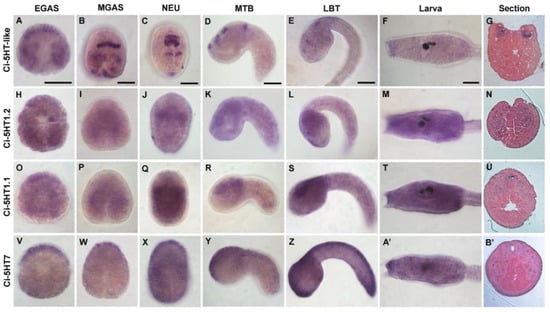 In the genome of C. intestinalis we identified five 5HTRs: Ci-5HT1.1 and Ci-5HT1.2, which appeared basal to all 5HT1 paralogs of vertebrates, Ci-5HT2, Ci-5HT7, and a highly divergent gene, Ci-5HT-like, which appeared basal to all G-coupled 5HT classes. The Aniseed database (https://www.aniseed.fr; last accessed on: 27 March 2023) reported expression levels of each gene obtained by RNA sequencing experiments in different developmental stages. For all 5HTRs, the level of expressions was very low, ranging from 0.092 to 7 FPKM (fragments per kilobase million), with the only exception of 5HT-like which was found at very high levels, up to 106 FPKM (Supplementary Materials, Additional File S1, Table S4 and Figure S1). During C. intestinalis embryogenesis, transcripts of only four 5HTRs out of the five identified genes were successfully detected by in situ hybridization, and their expression pattern was described from the gastrula to larva stage. Despite the efforts, all the attempts to clone Ci-5HT2 failed even if different amplification conditions and cDNA libraries were employed. Further analysis of the annotated sequence could help to solve the characterization of this gene. All 5HTRs were expressed in different embryonic districts, confirming the wide distribution of serotonin receptors already reported in many animals [6,10,17]. In vertebrates, 5HTRs were found in different areas of the central nervous system (CNS), in the vascular system, gastrointestinal tracts, as well as in muscles and epidermis [2,5,6,10,43,65,66,69]. Among invertebrates, most of the studies were performed on mollusks and arthropods. In Aplysia californica, three 5HTRs were cloned: Ap5-HTB1 was identified in the reproductive system, Ap5-HT2B was nervous system-specific and 5HT1Ap was found in different structures such as gills, heart, CNS, kidney, and ovotestis [17,18,22]. Similarly, in the pond snail Lymnaea stagnalis, 5HTLym was detected in the CNS and adult heart, while 5HT2Lym was mainly present in the esophagus, salivary gland, sperm-oviduct, and heart [17,18,23,24]. In Drosophila melanogaster, expression of 5HT1B receptor started in late embryonic stages in CNS, and persisted in the same territories in adults [70]. On the contrary, 5HT2Dro was expressed both in the adult stage and during embryogenesis and was involved in segmentation processes [19]. In the armyworm Mythimna separate, two isoforms of the 5HT7 receptor were characterized and they were co-expressed in all the analyzed tissues, including the brain, antennae, wings, and gut [14]. The wide expression patterns observed in embryos and larvae of C. intestinalis were thus consistent with those reported in many other species. Noteworthy, even if sometimes the hybridization signal was faint, transcripts of all the 5HTRs were detected in CNS lineage, suggesting a role in neural development as reported in vertebrates [6,69].