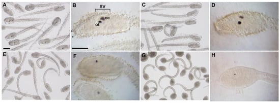 Control samples displayed a normal morphology with an elongated trunk and a straight motile tail (Figure 3A). Larvae exposed to increasing concentrations of WAY-100635 showed altered phenotypes from 25 µM: the trunk appeared roundish with malformed palps and the tail was often curved (Figure 3E,F). In the sensory vesicle of control samples, the two pigmented organs, the otolith and the ocellus, were well developed (100%, N = 71; Figure 3B); and from 10 µM WAY-100635, a reduction in pigment was instead observed in treated samples (Figure 3C–H): in 79% of the swimming larvae (N = 75), the pigment organs were recognizable by their shape but melanin content was drastically reduced. The ocellus seemed to be more affected by the treatment as it was completely demelanized from 25 µM WAY-100635 (96.6% of hatched larvae, N = 59, Figure 3F), whereas some granules of melanin were still observable in the otolith of all the larvae treated with 50 µM WAY-100635 (100% of the hatched larvae, N = 59, Figure 3H).