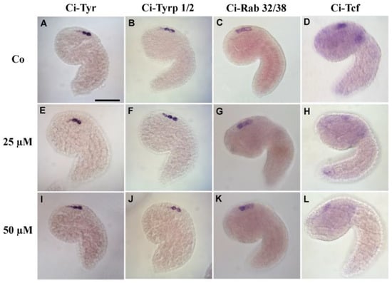 Effects of WAY-100635 treatment on genes involved in pigment cell formation. Expression patterns of Ci-Tyr, Ci-Trp 1/2, Ci-Rab 32/38, and Ci-Tcf in control (Co) (A–D) and embryos exposed to 25 (E–H) and 50 (I–L) µM WAY-100635 at mid-tailbud stage. Scale bar: 50 µm.